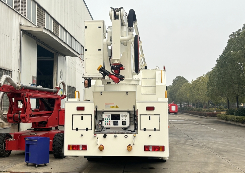 案例:某30層寫字樓火災(zāi)中,該車通過(guò)25米臂架直達(dá)起火樓層,配合遙控水炮快速壓制火勢(shì),避免人員傷亡。